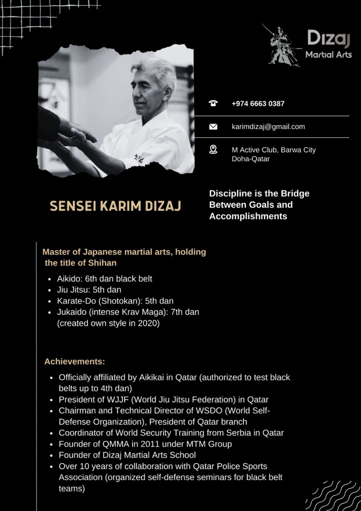 He shifted to Qatar for a sport promotions which was initiated by the Qatari government. Sensei Dizaj started to build up on 2007 Musashi International Martial Arts Academy recognized by AWA in Doha, Qatar. He is currently the manager and chief instructor of the academy.